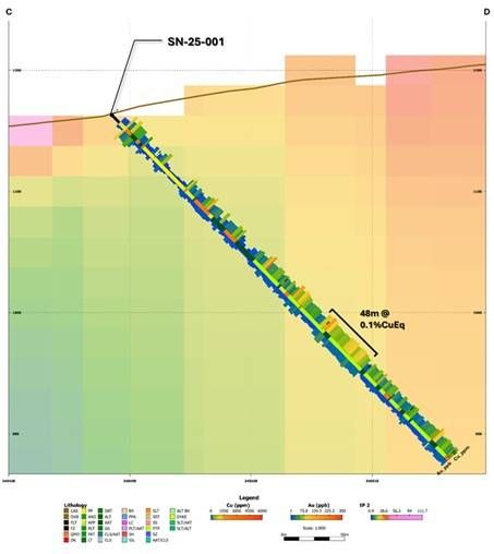 The Copper Creek hole returned the stronger inaugural result and provides direct confirmation that the historical mineralized corridor remains intact. SN-25-001 returned lower overall grades, but it successfully intersected the intrusive-volcanic architecture, patchy potassic overprint, and sulphide-bearing vein systems expected in a fertile porphyry environment. The Company believes the two holes together materially improve targeting confidence for 2026 follow-up drilling at both satellite areas.